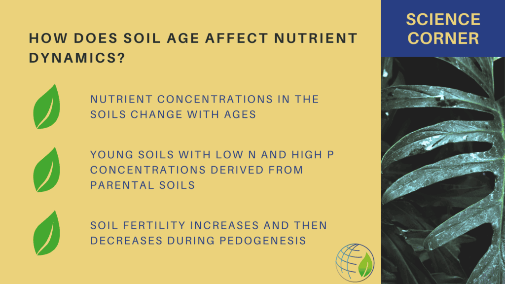They determined the dynamics of nutrient concentrations in the soils of different ages and, in the case of phosphorus (P), distributions among different fractions or pools. They showed that young soils have low concentrations of nitrogen (N) because very little N exists in most parent materials. Yet, soil N content increases rapidly during the early stages of ecosystem development as biological nitrogen fixation kicks in.