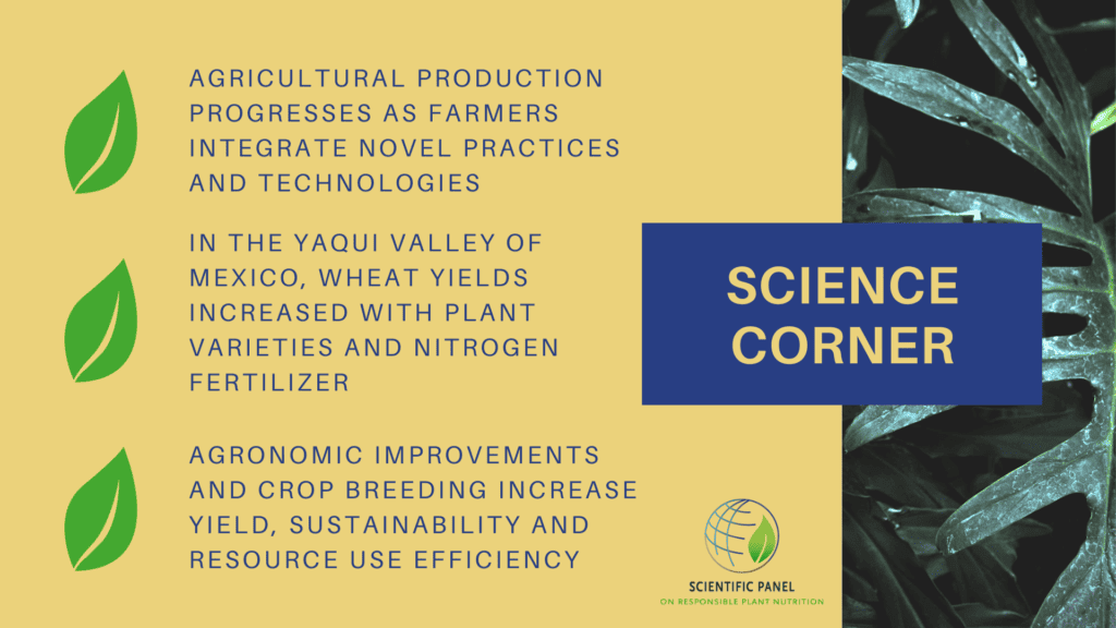Wheat yields in the valley increased about 250%, from 2 t/ha in 1960 to 7 t/ha at present. But this yield increase was not steady: yields rose fastest during 1960-1980 as high-yielding varieties were adopted and nitrogen fertilizer use increased from about 40 to 180 kg N/ha. From 1980 to 1999, planting on raised beds and phosphorus fertilizers were adopted widely, but crop rotational diversity declined and yield growth slowed down. Since 2000, consolidation of operational crop units and more skilful and timely agronomic management resulted in accelerated yield growth. Overall, this study demonstrates how in crop production systems breeding and agronomic improvements go hand in hand to increase yield, resource use efficiency and sustainability. In the Yaqui Valley, yield growth and system sustainability are deemed to be good, whereas nitrogen use efficiency and diversity lag behind.